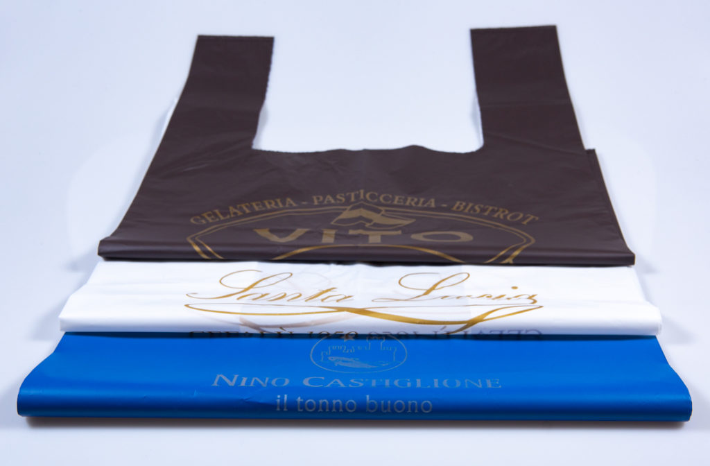 Gli shoppers bio, proposti con manico a canottiera, possono essere prodotti con fondo trasparente, bianco e colorato e personalizzati fino a tre sovrastampe.
