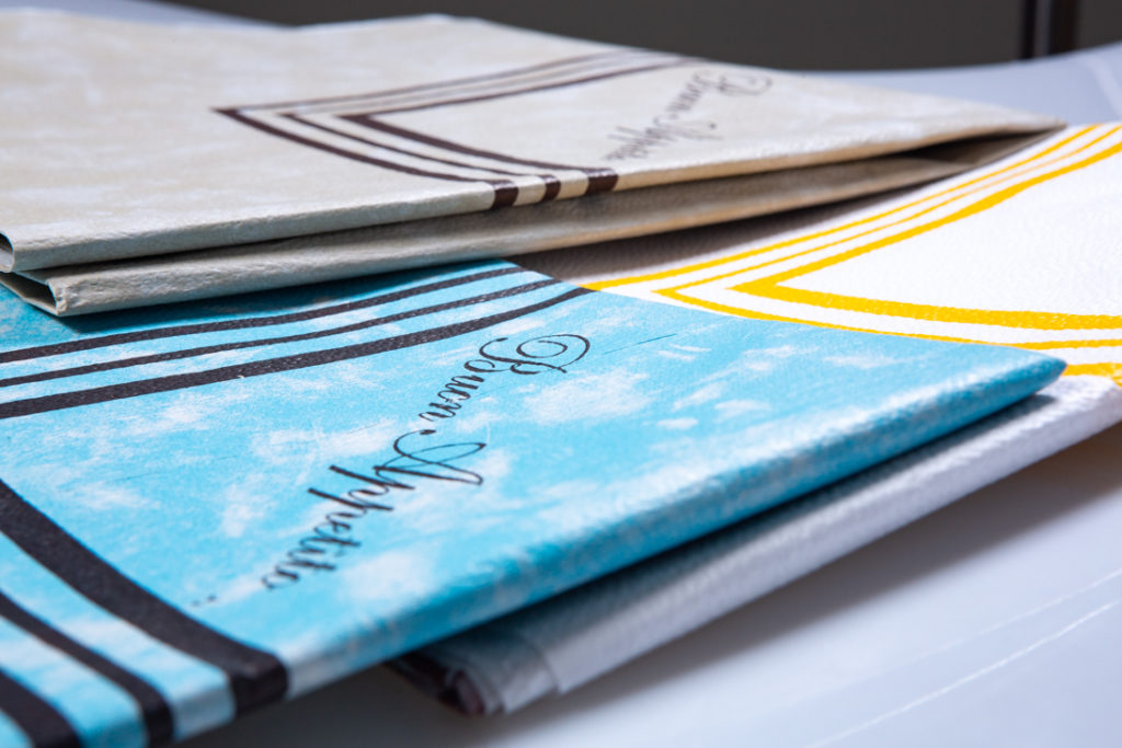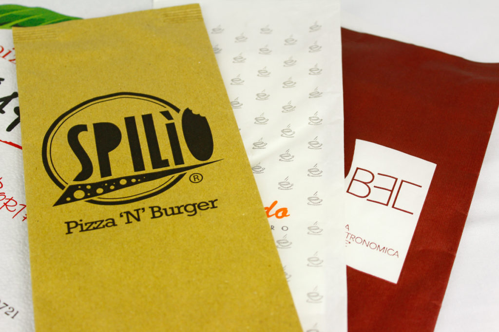 Le buste porta posate sono realizzate per proteggere igienicamente le posate e rendere più colorata l’immagine della tavola. Possono essere personalizzate secondo le esigenze dei clienti, con stampa fino a tre colori.
